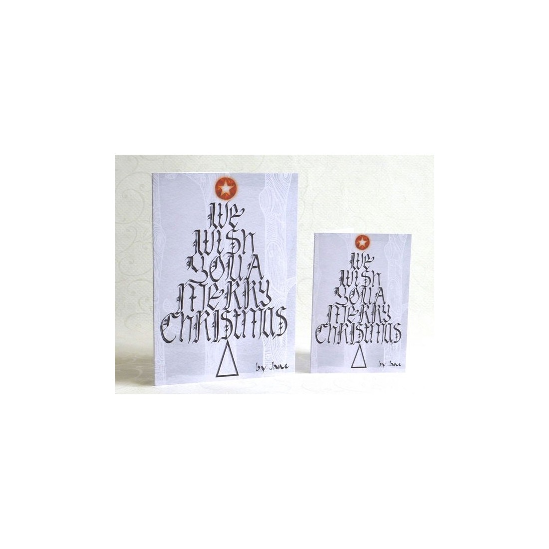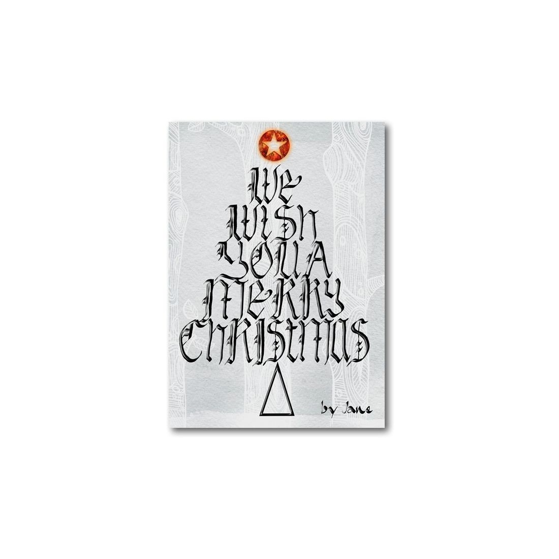 Nous vous souhaitons un Joyeux Noël. Une jolie carte calligraphique qui a ces mots choisis dans un style gothique pour former un arbre de Noël placé dans une forêt d'hiver. Complété par une étoile rouge brillante.