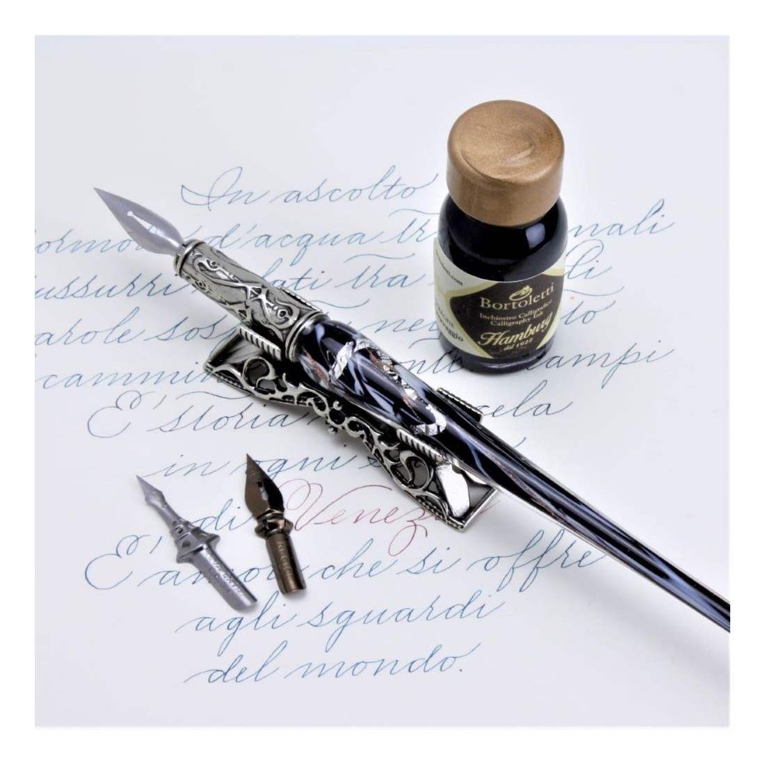 Cette couche de calligraphie comprend un stylo en verre de Murano avec un porte-nib en bronze, trois des pointes vintage parfaitement préservées et une bouteille d'encre d'excellente qualité adaptée à une large gamme d'utilisations de calligraphie. La combinaison rend l'idéal idéal pour quiconque souhaite un kit d'écriture prête à l'emploi avec un attrait solide du patrimoine.
