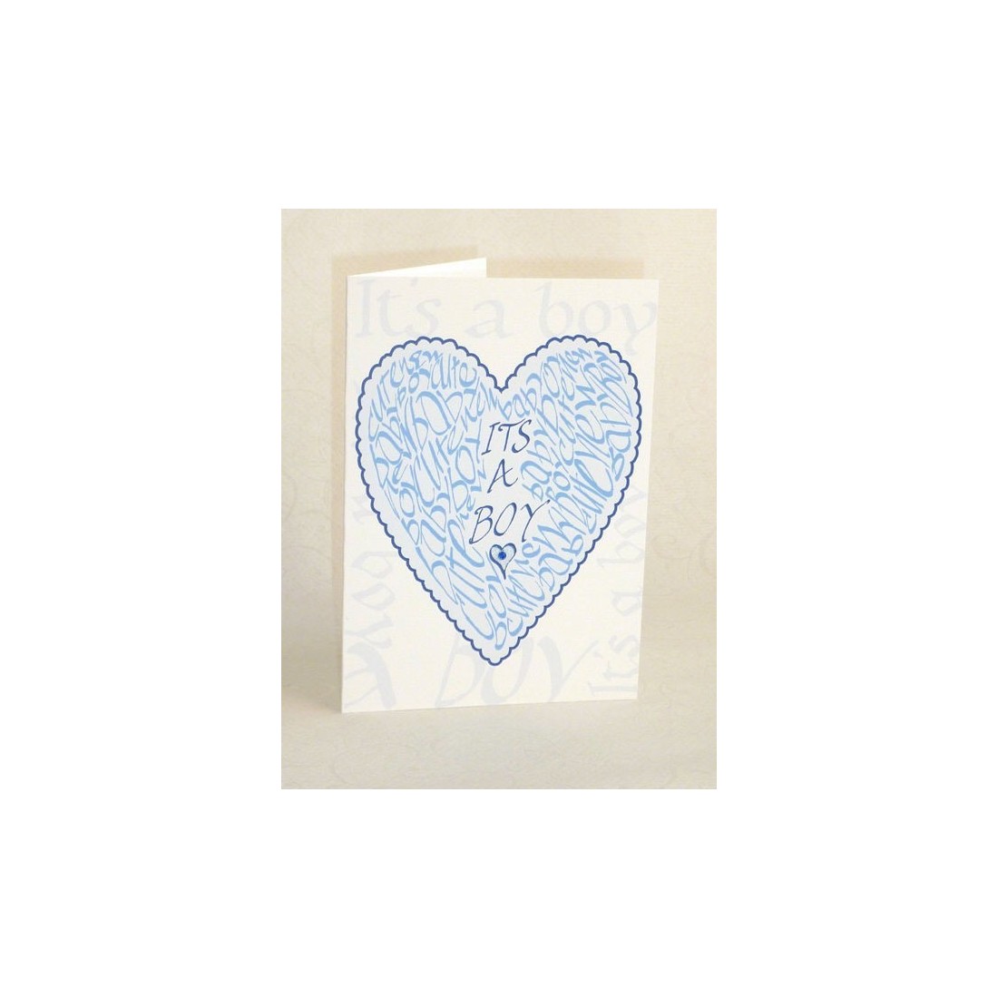 Cette carte a été créée à l'aide d'un script d'inspiration de calligraphie, ce qui lui donne une sensation plus artistique et personnelle qu'une carte de bébé imprimée standard. La conception contient les mots: C'est un garçon, Petit garçon mignon, Nouveau bébé, aidant à créer un message chaleureux et célébrant qui convient à l'occasion.