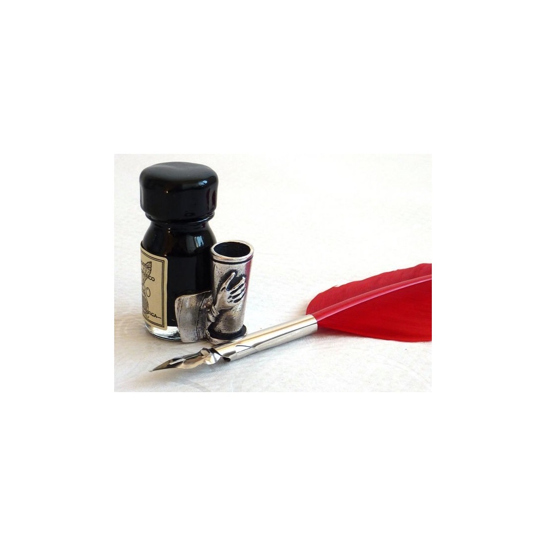 Cet ensemble comprend le La Kaligrafica Petit stylo de calligraphie de plume rouge, une bouteille d'encre noire et un porte-plume en étain. La combinaison crée un ensemble d'écriture bien présenté prêt à utiliser ou de donner en cadeau.