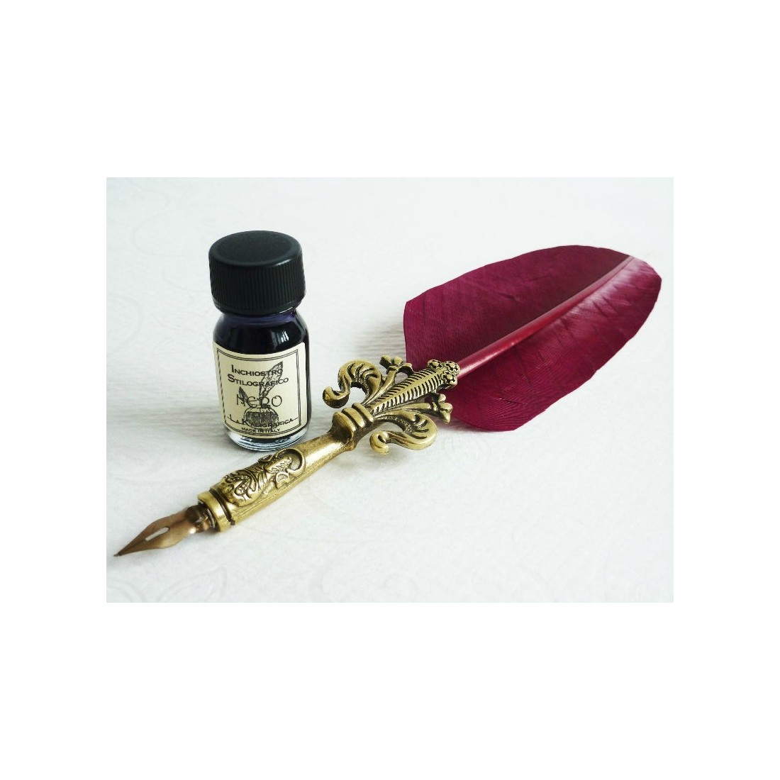 Les La Kaligrafica Fleur d'Lys Feather Quill et l'encre En Bourgogne est un cadeau d'écriture italien fabriqué à la main en plumes d'oie authentiques, avec une nib en métal durable, une encre noire et une boîte de présentation premium avec fenêtre de visualisation.