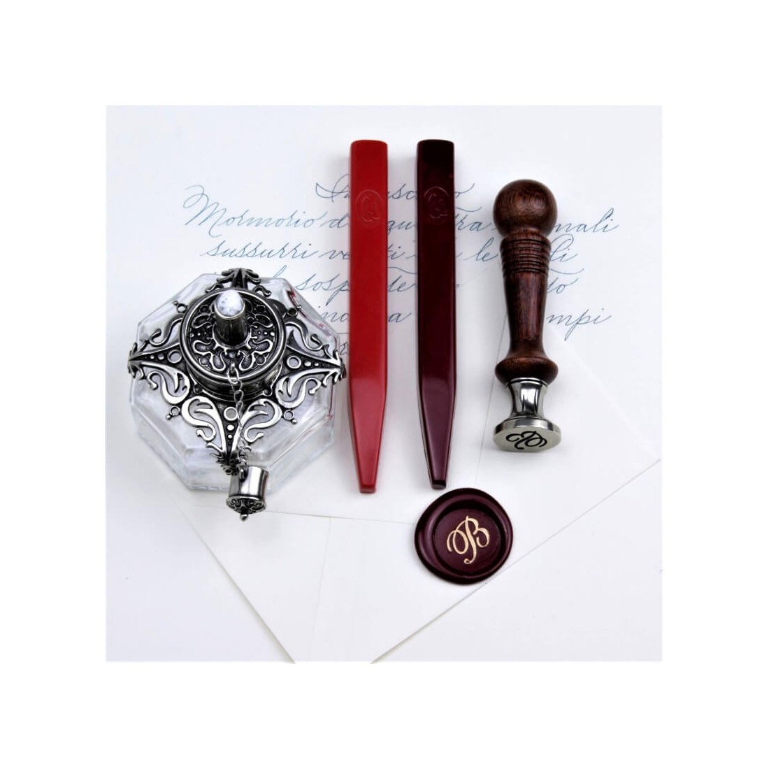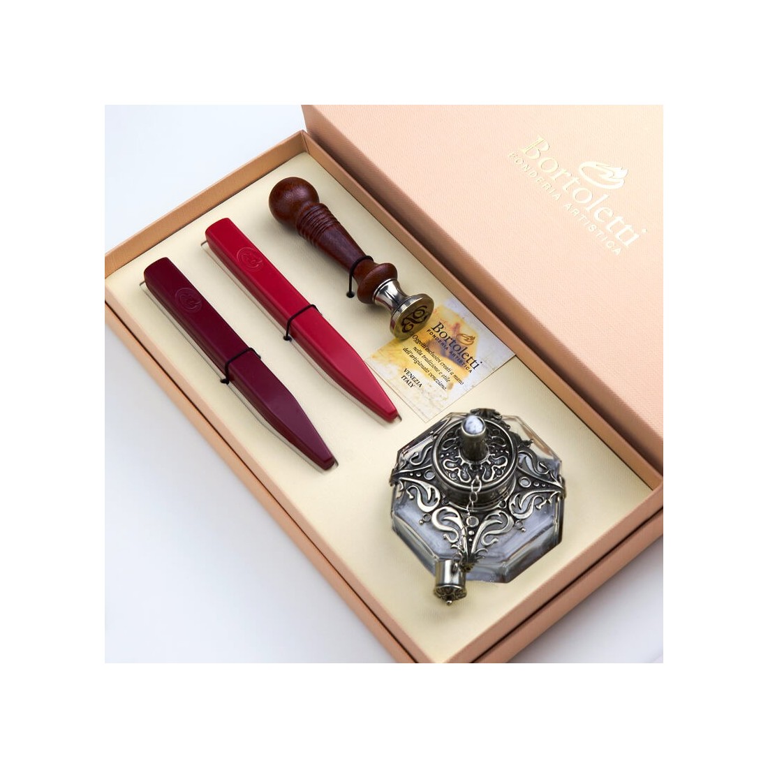 Questo Bortoletti Il kit di tenuta include un Maniglia di tenuta in legno, un interchangeable 22 mm wax seal stamp, due bastoncini di cera sigillanti, un bruciatore di alcool, imballaggio di presentazione e un certificato di garanzia. È un set compatto e utile per i clienti che desiderano un'esperienza tradizionale di sigillatura a cera con uno styling italiano premium.