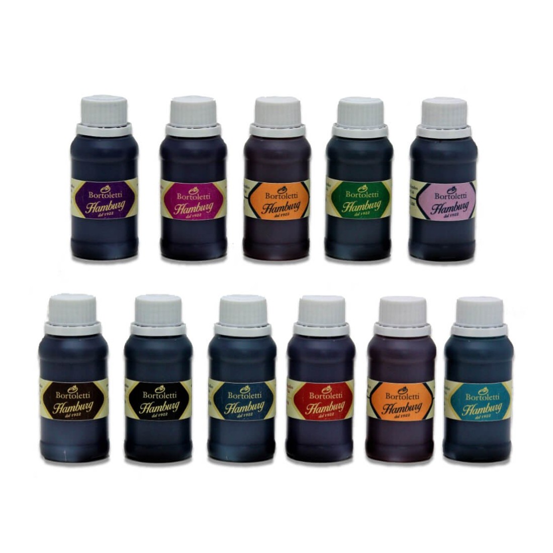 Bortoletti Gli inchiostri di calligrafia sono prodotti in Italia da Hamburg utilizzando la tradizionale esperienza di inchiostro. La formulazione attentamente equilibrata offre flusso di inchiostro regolare, prestazioni affidabili e forte intensità del colore attraverso una vasta gamma di stili di calligrafia.