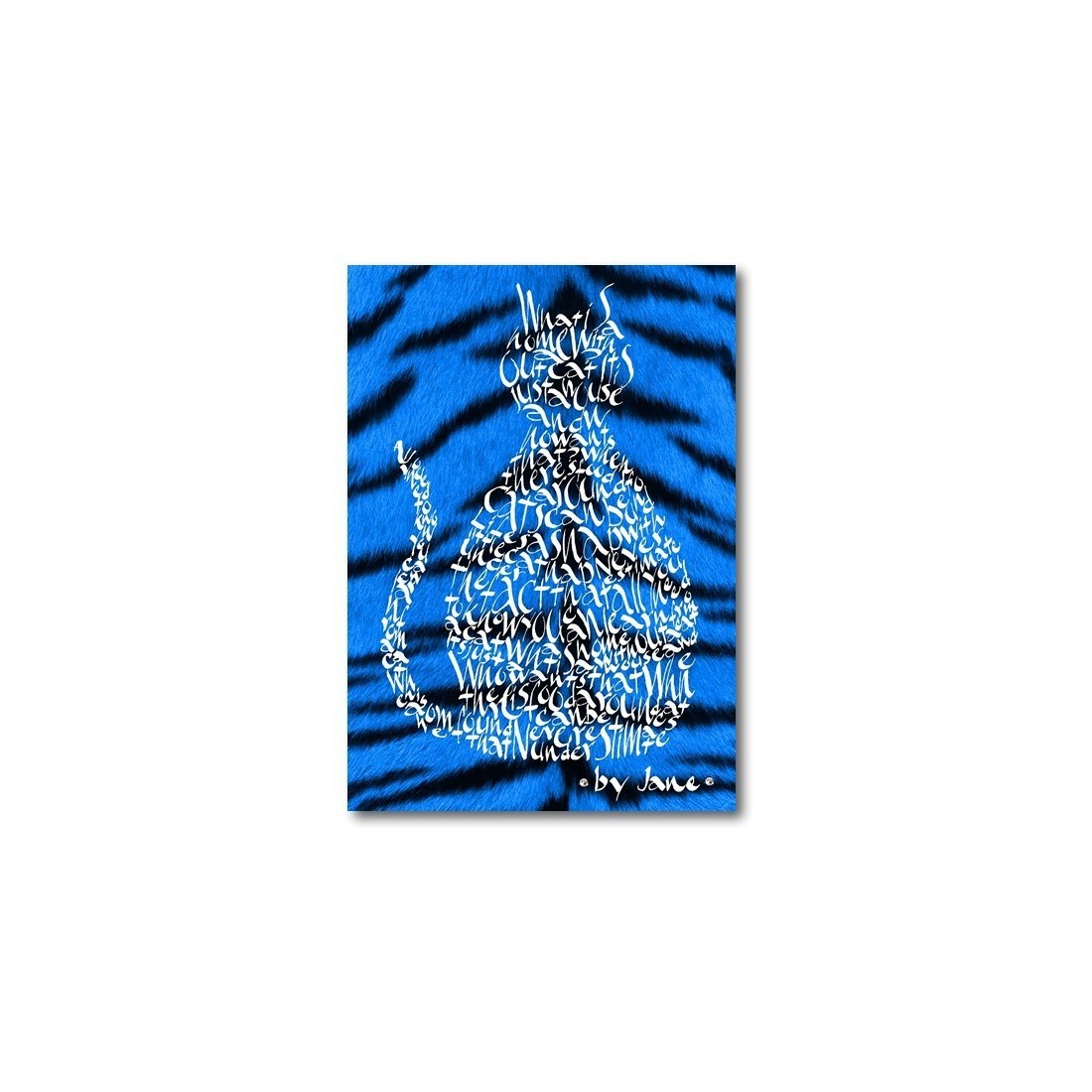 La carta del gatto della pelle della tigre blu elettrica da Calligraphy Arts è un unico biglietto di auguri a mano disegnato da Jane, con arte di calligrafia felina che includeva "Cos'è una casa senza gatto?", "Tutto ciò che devi sapere che puoi imparare da un gatto" e "la vita è uno scatto con un piccolo catnap" su uno sfondo blu di tigre blu sorprendente.