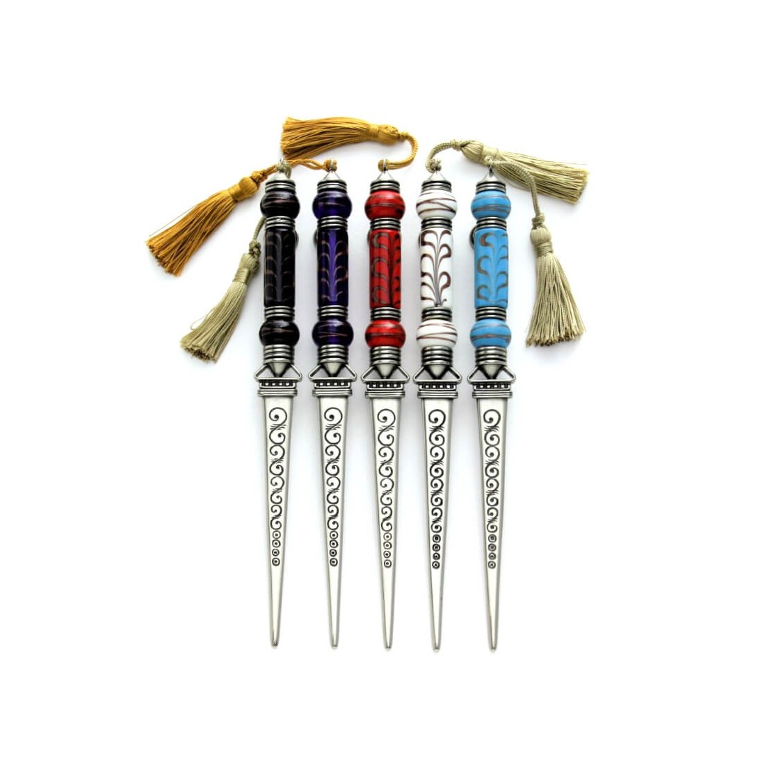 La Bortoletti Bellucci Veletian Glass Letter Opener è un accessorio da scrivania finemente progettato per coloro che apprezzano gli eleganti strumenti di scrittura e la tradizionale lavorazione italiana. Caratterizzato da dettagli in bronzo cesellati a mano e da una decorativa perle di vetro di Murano con ornamenti floreali, questo distintivo apriscatole riflette il patrimonio artistico di Bortoletti Fonderia Artistica a Venezia.