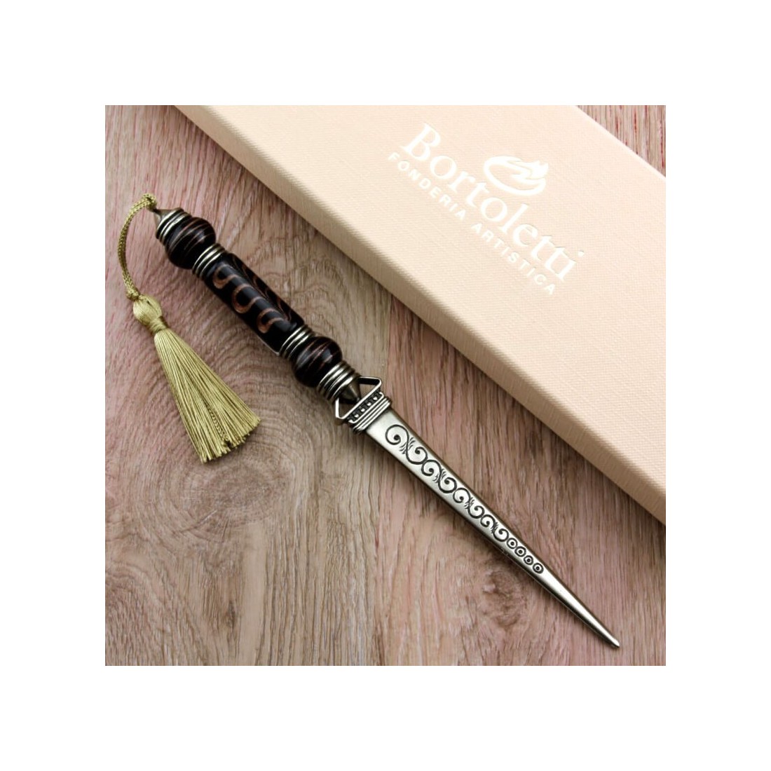Il corpo in bronzo dell'opertetto della lettere è castigliato e rifinito a mano da esperti Bortoletti artigiani. La lama è finemente decorata e cesellata a mano, con un particolare arco ornamentale che conferisce al pezzo un'eleganza in stile antico adatto a una scrivania tradizionale.