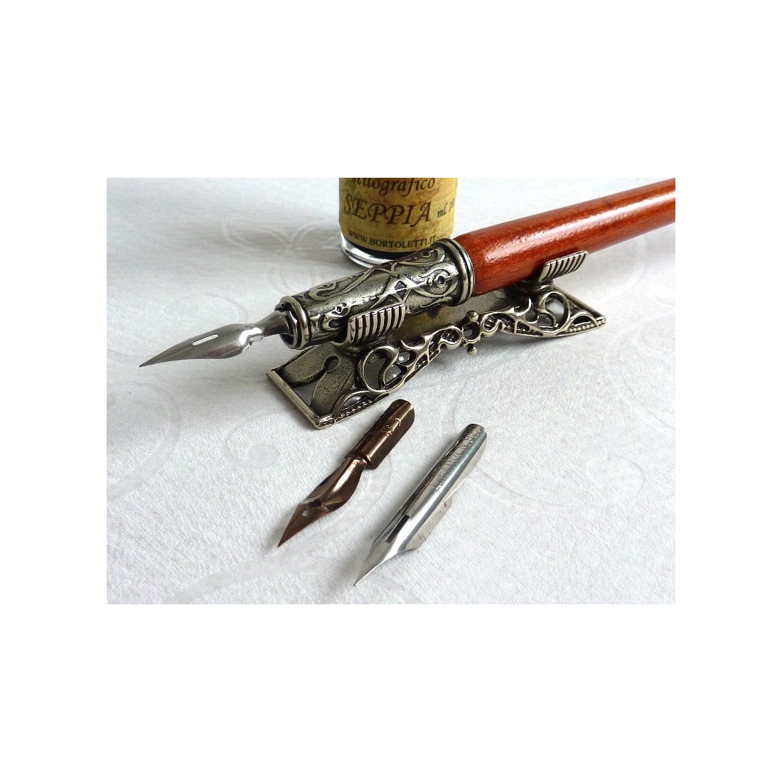 Set di penne in legno con pennino. Ottimo valore e raffinatezza. Set composto da una penna in legno con bronzo e placcato in argento nichel, pennino in argento nichel, bottiglia di inchiostro e tre pennini antichi. Made in Italy by Bortoletti Fonderia Artistica.