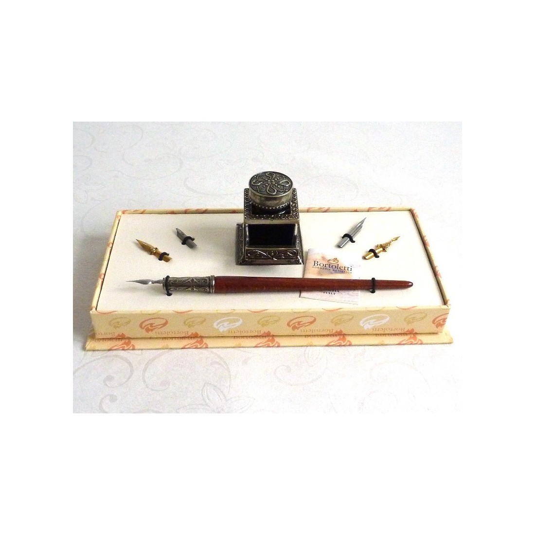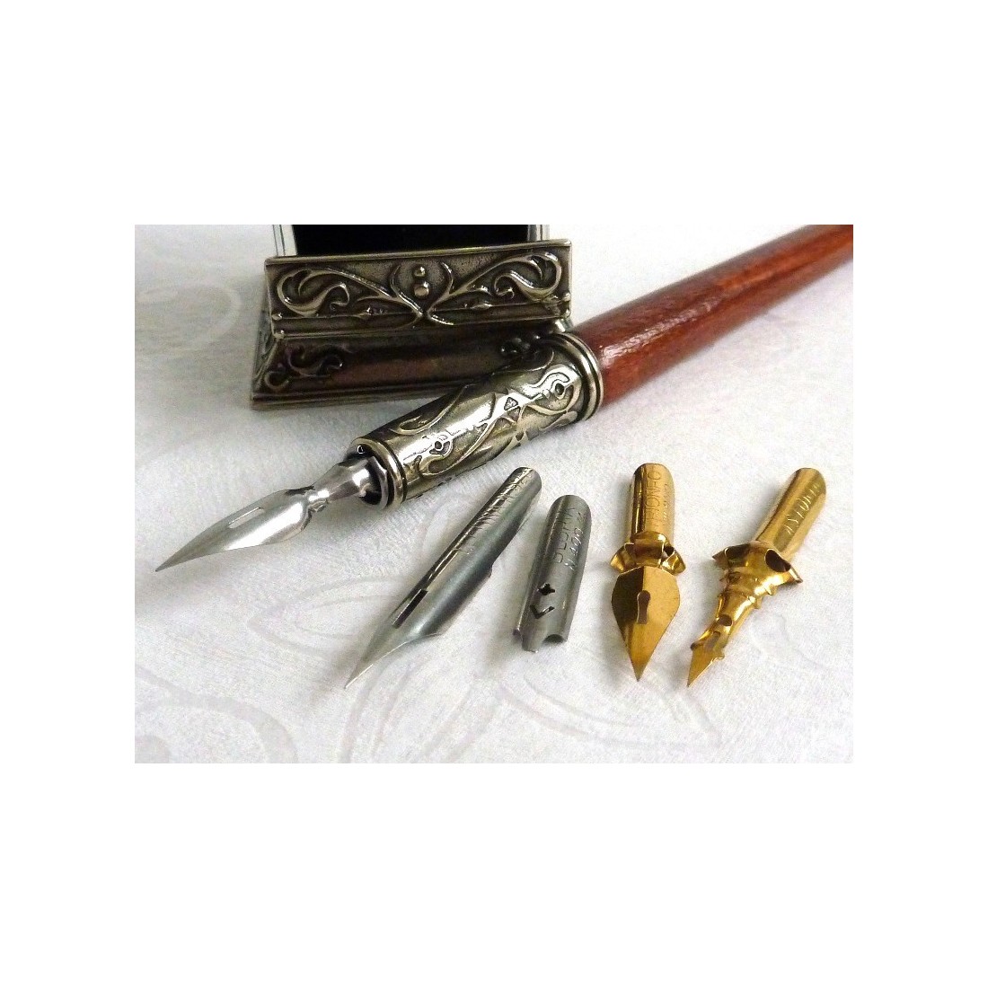 Set di penne in legno con inkwell e pen riposo. Ottimo valore e raffinatezza. Set composto da una penna in legno con porta nib in bronzo placcato in argento nichel, inkwell e quattro penni antichi.