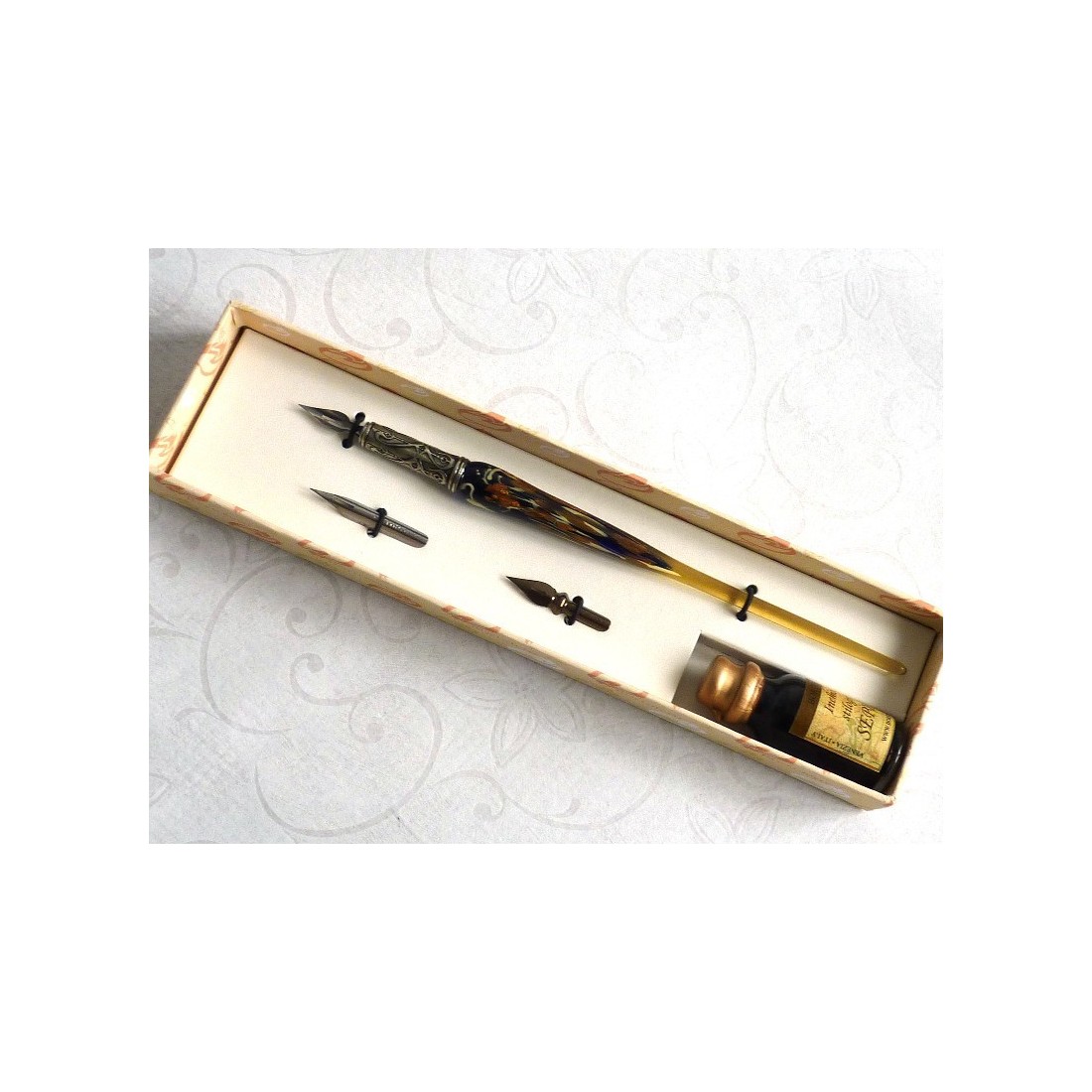 Foglia d'oro e set di penne di vetro. Un set di penne calligrafiche, finemente realizzato a mano, che comprende una penna di vetro di Murano con fiocchi di foglia d'oro, tre penne e una bottiglia di inchiostro. Disponibile in una gamma di colori meravigliosi. Made in Italy by Bortoletti Fonderia Artistica.