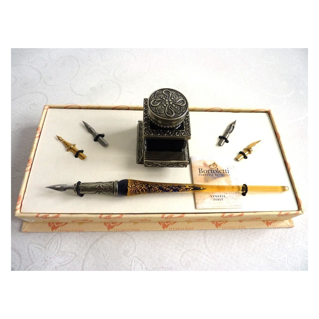 Set di penne in vetro di Murano e oro. Una bella artigianale, rifinita a mano, set di penne calligrafiche. Comprede una penna in bronzo placcato argento vetro & nickle, quattro nibs e un inkwell ornato. Disponibile in una gamma di colori. Prodotto in Italia da Bortoletti Fonderia Artistica.