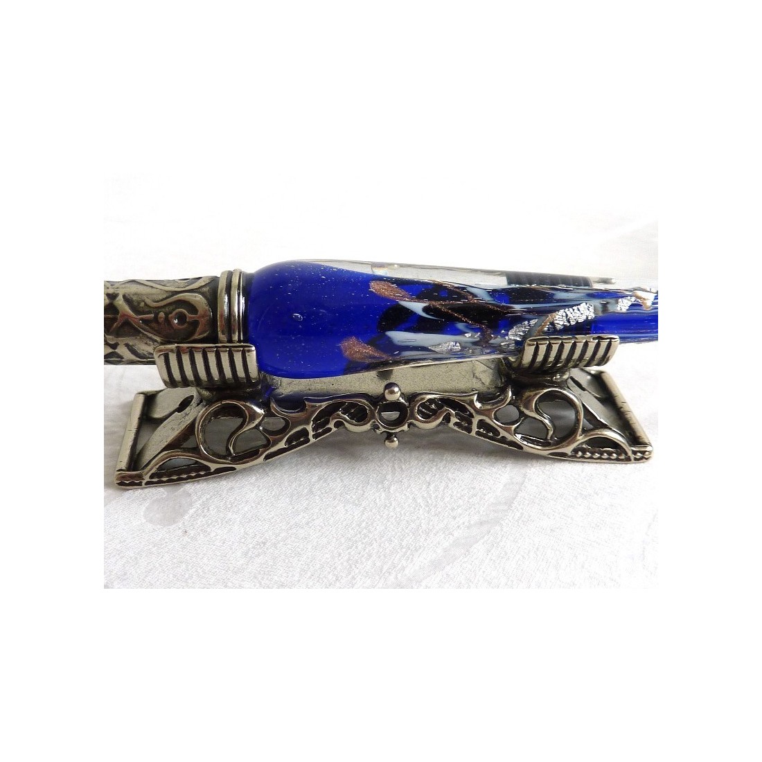Foglia d'argento e penna di immersione di vetro. Una penna calligrafia con vetro di Murano e foglia d'argento, splendidamente realizzata a mano. Comprede un vetro & nickle argento placcato, penna dip bronzo, tre penne e un ornato pennino riposo. Disponibile in una gamma di colori meravigliosi.