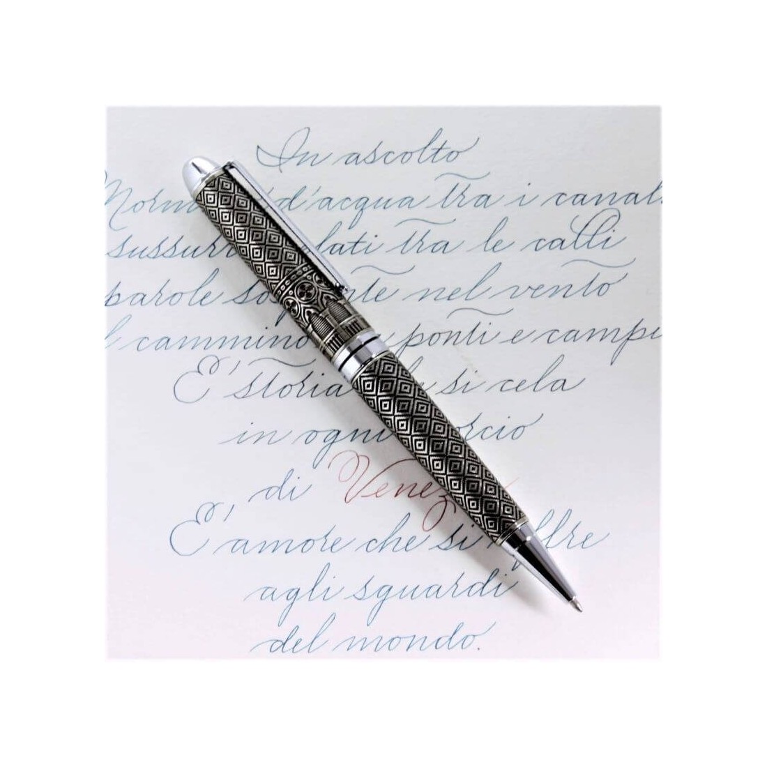La Bortoletti Ducale Ballpoint Pen è uno strumento di scrittura raffinato creato in onore dei doges e lo splendore del Palazzo Doge a Venezia. Ispirato a uno dei più importanti edifici storici della città, questa penna meravigliosamente fatta riunisce prestazioni di scrittura pratica e artigianato decorativo italiano, rendendolo una scelta distintiva per uso quotidiano, esposizione scrivania e donazione.