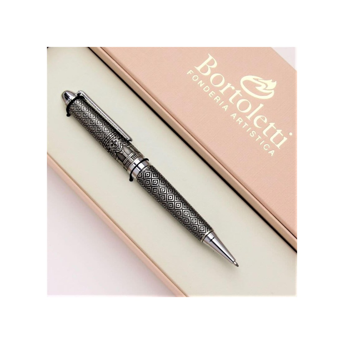 La penna è realizzata in bronzo e riflette le tradizioni decorative per le quali Bortoletti è noto La sua forma e dettagli sono ispirati ai simboli tratti dal ricordo collettivo di Venezia, riunendo l'influenza storica e il gusto moderno in uno strumento di scrittura ricco di personalità e stile.