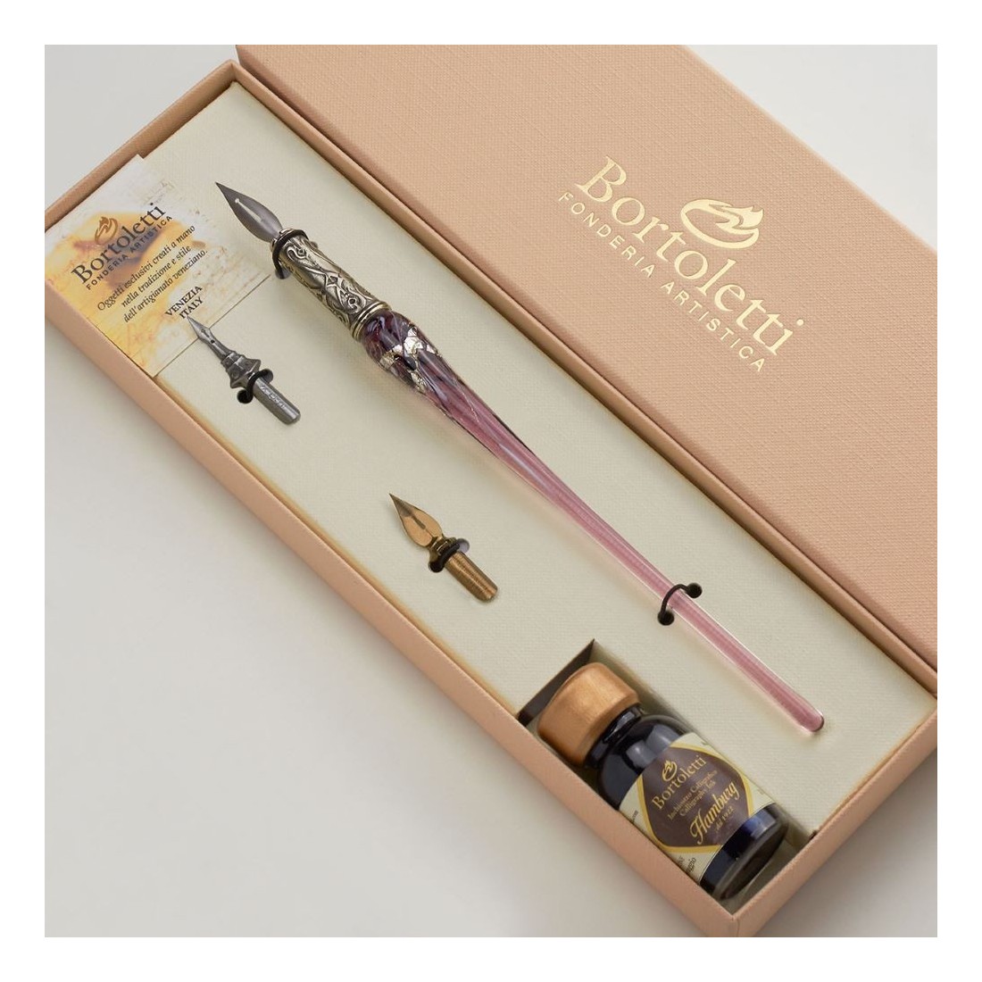 Bortoletti Calligrafia di vetro di Grimani Murano Set con foglia d'argento è un set di scritte veneziane realizzato a mano realizzato con vetro di Murano lampadario, dettaglio di foglie d'argento, una bottiglia da 15 ml di Hamburg Inchiostro di calligrafia e pennini intercambiabili per una gamma di stili di scrittura. Disponibile in nove eleganti colori in vetro e presentato in una confezione regalo con un logo in oro stampato a caldo, è una scelta raffinata per la pratica della calligrafia, la grafia elegante e il dono.