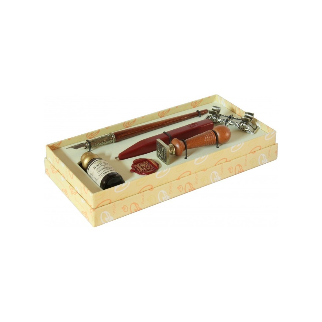 Dit elegante Bortoletti set bevat een houten kalligrafie pen, een Horizontale penhouder in nikkel-verzilverd brons, een Houten wax afdichting handvat, een Verwisselbare 22 mm afdichtplaat, een 13 cm Sluiting Wax Stick, een elegante presentatie geschenkdoos en een certificaat van garantie. Het biedt een praktische en aantrekkelijke manier om handgeschreven correspondentie te combineren met traditionele wasafdichting in een gecoördineerde set.