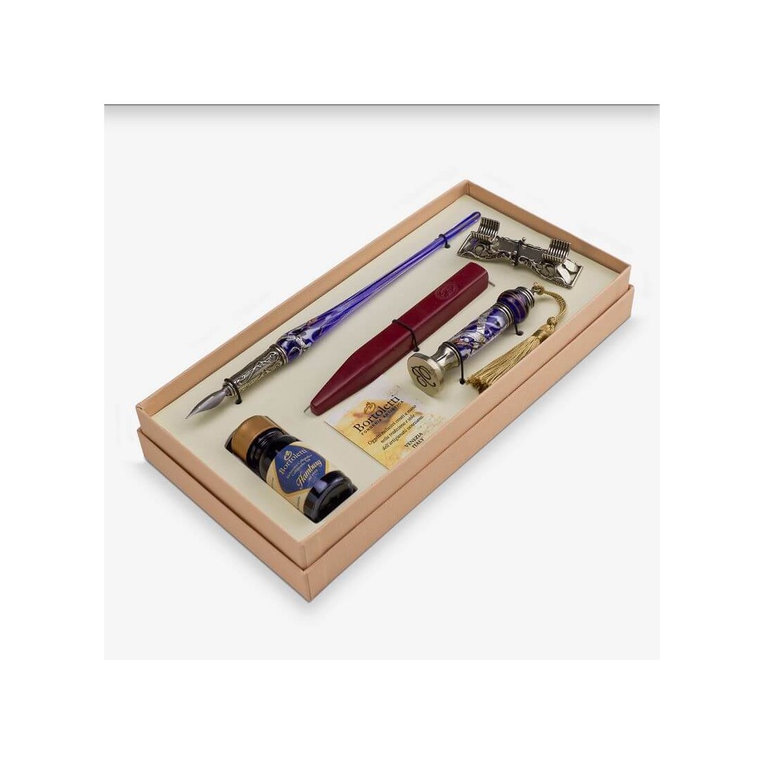 Dit onderscheidend vermogen Bortoletti set bevat een Murano glazen kalligrafie pen, een nikkel-verzilverde brons horizontale penhouder, een Murano glazen wax afdichting handvat, een Verwisselbare afdichtplaat, kalligrafie inkt, presentatie verpakking en een certificaat van garantie. Het biedt een elegante manier om handgeschreven correspondentie te combineren met traditionele wasafdichting, allemaal binnen een gecoördineerde Venetiaanse set.