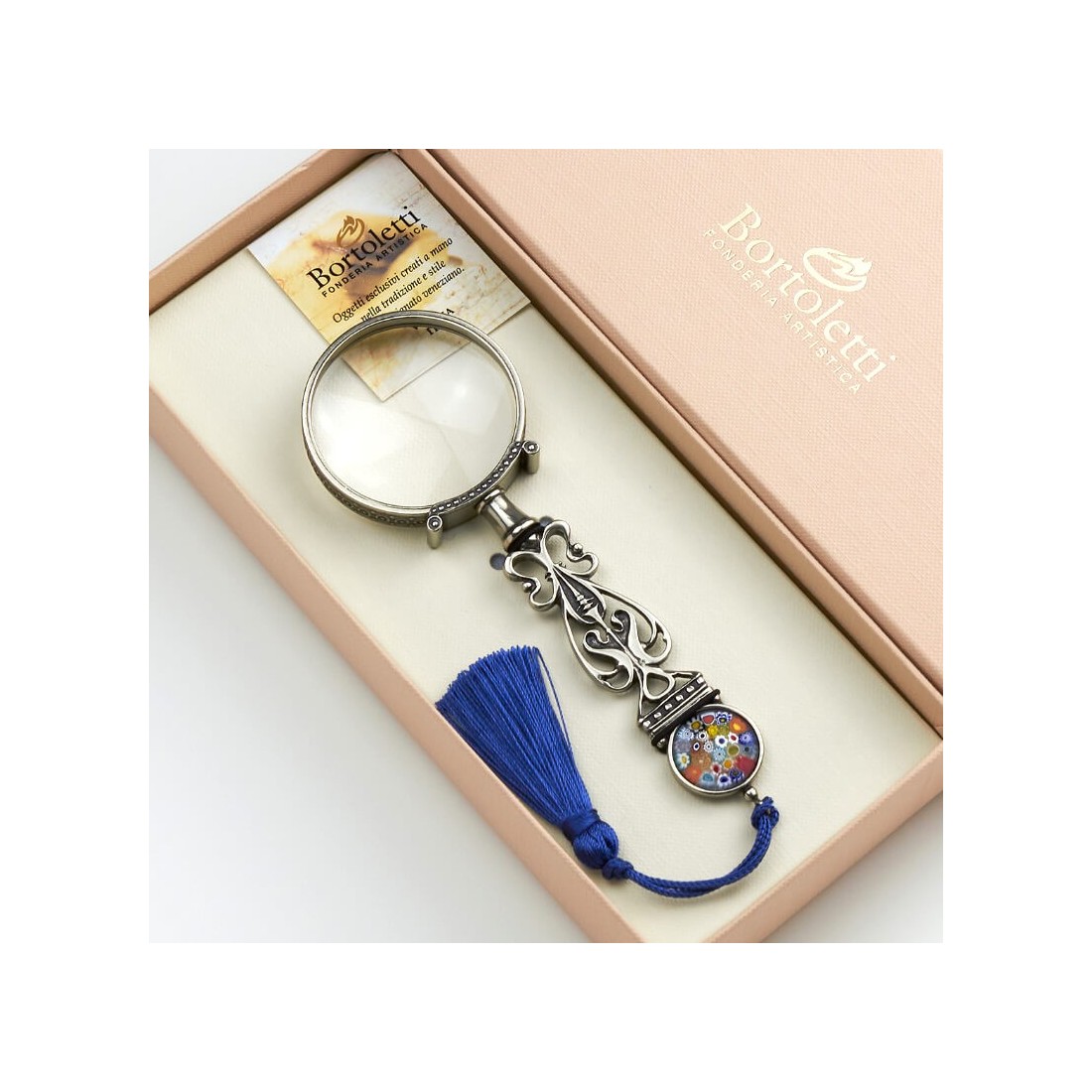 Bortoletti Kanaal Vergrootglas met Venetiaanse Murrina is een verfijnd bureau-accessoire handgemaakt in brons en verrijkt met een kostbare Venetiaanse Murrina in het gieten. Elegant, decoratief, en vol met Venetiaans karakter, het is een prachtige keuze voor het schrijftafel, studie of onderscheidend geschenk geven.