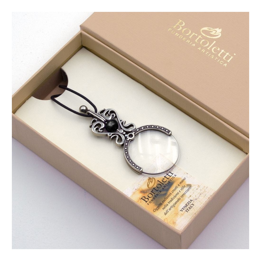 Bortoletti staat bekend om elegante bureaukrachten, schrijfinstrumenten en decoratieve objecten geïnspireerd door Venetië, Murano Glass Artistry, en traditioneel Italiaans vakmanschap. De Ranieri-vergrootglas hanger weerspiegelt dat erfgoed door zijn hand-afgewerkte bronzen lichaam, murano glazen parel met zilverblad en sieraden-geleide ontwerpbenadering. Het is een accessoire dat praktisch gebruik combineert met de schoonheid van de ambachtelijke maken.