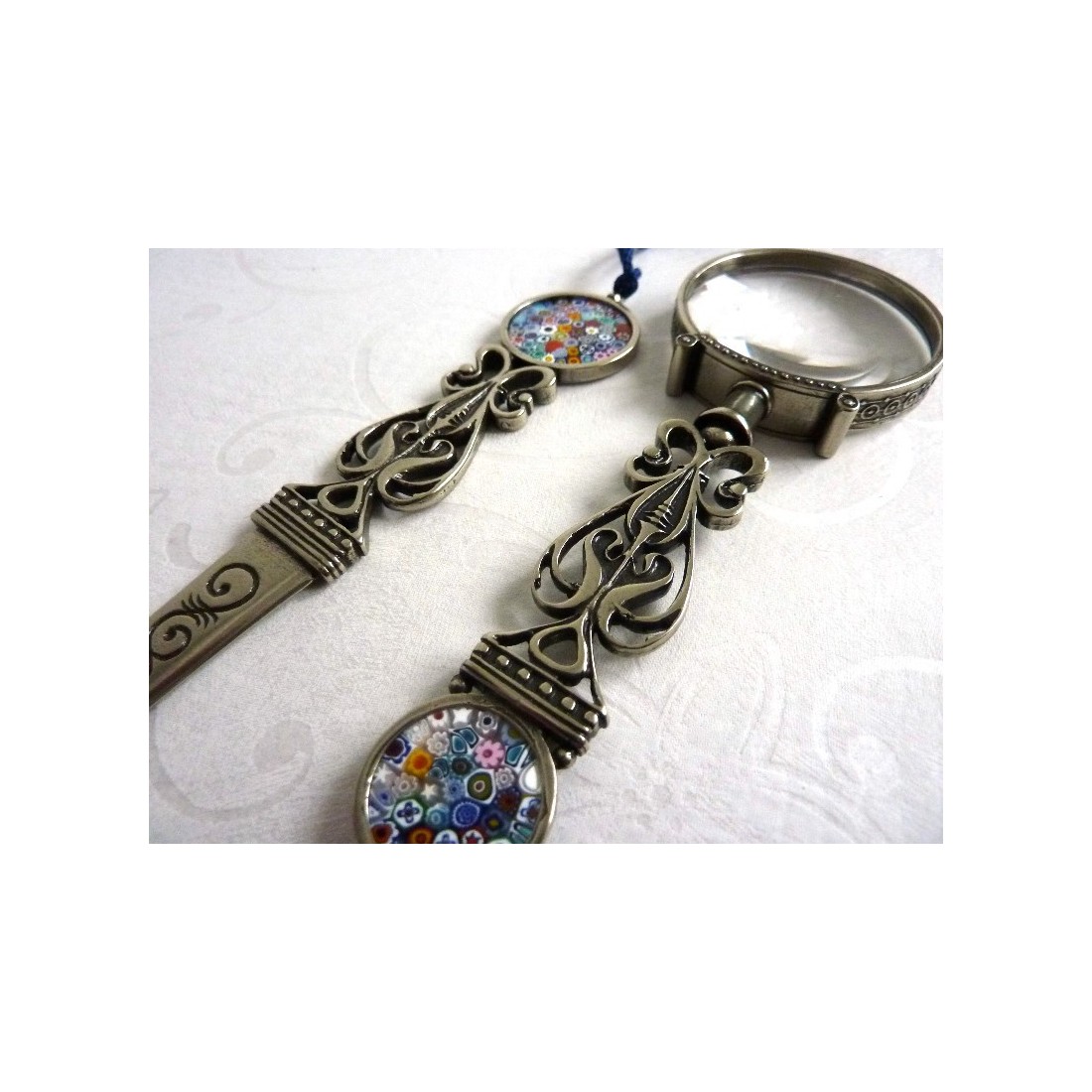 Briefopener en vergrootglas, nuttige voorwerpen en decoratieve elementen zien er geweldig uit op uw bureau. Ze zijn gemaakt van nikkelzilver met zeer kleurrijke Murrina glaskralen. Voor mensen die houden van de stijl van Venetiaanse elegantie. Vervaardigd in Italië door Bortoletti Fonderia Artistica.