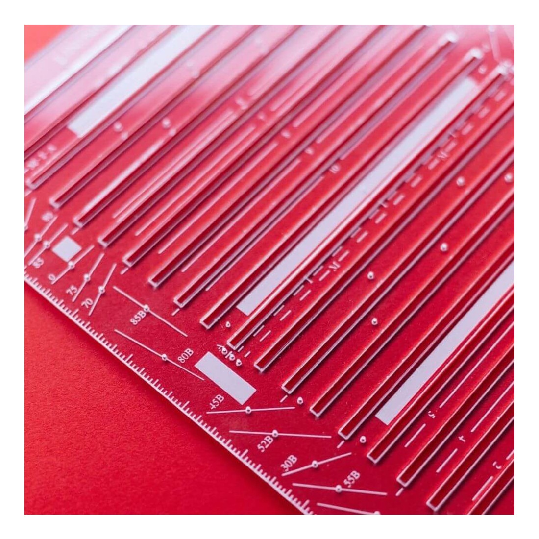 Gefabriceerd van CLEAR 3 mm PERPEX, de sjabloon zit plat en stabiel op pads of blanco vellen, zodat u horizontale en axiale lijnen met vertrouwen en herhaalbare nauwkeurigheid kunt regeren. De transparantie houdt uw lay-out te allen tijde zichtbaar, waardoor nauwkeurig en intuïtief is.