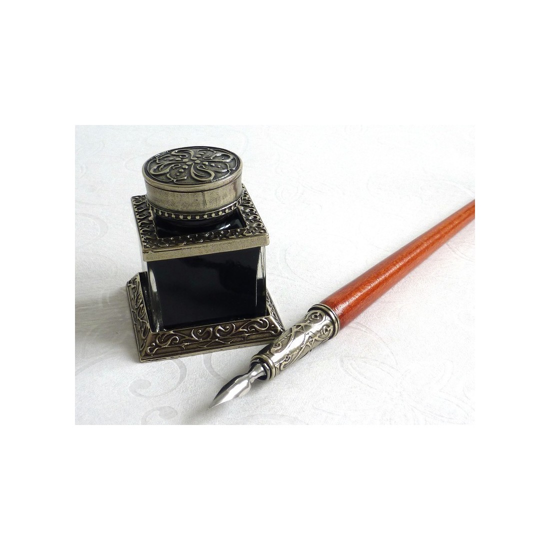 Houten DIP-pen, inkwell & penhouder. Deze set bestaat uit een houten pen met bronzen penphouder in nikkel zilver en een inktpot. De Nickle Silver Decoration verrijkt de houten pen, inktpot en de penhouder. Vervaardigd in Italië door Bortoletti Fonderia Artistica.