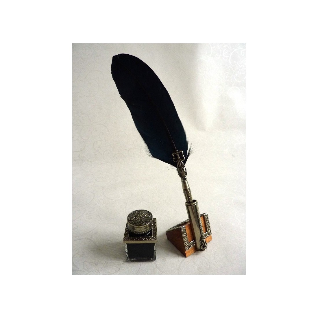 Veren ganzenveer, inktpot en penhouder. Deze set bestaat uit een kalligrafiepen van ganzenveren met bronzen penpunthouder verguld in nikkelzilver, inktpot en penhouder, een perkament met de geschiedenis van het schrijven en een penhouder. De nikkel-zilveren decoratie verrijkt de verenpen, de inktpot en de penhouder. Een elegant cadeau-idee. Ideaal om uw gedachten in stijl op te schrijven.