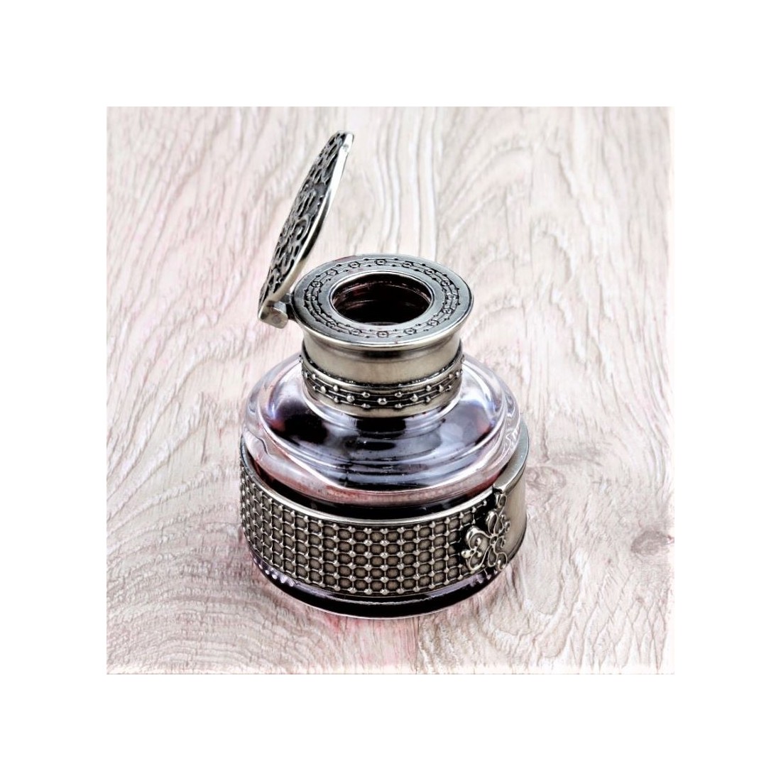 Inkwell är gjord av glas och färdig med fin hand-chiselled brons, vilket skapar en dekorativ kontaktpunkt med real skrivbords närvaro. Dess dekorerade gångjärnslock ger ytterligare karaktär och förfining, vilket gör inkwell en liten pärla av design och hantverk i sig.