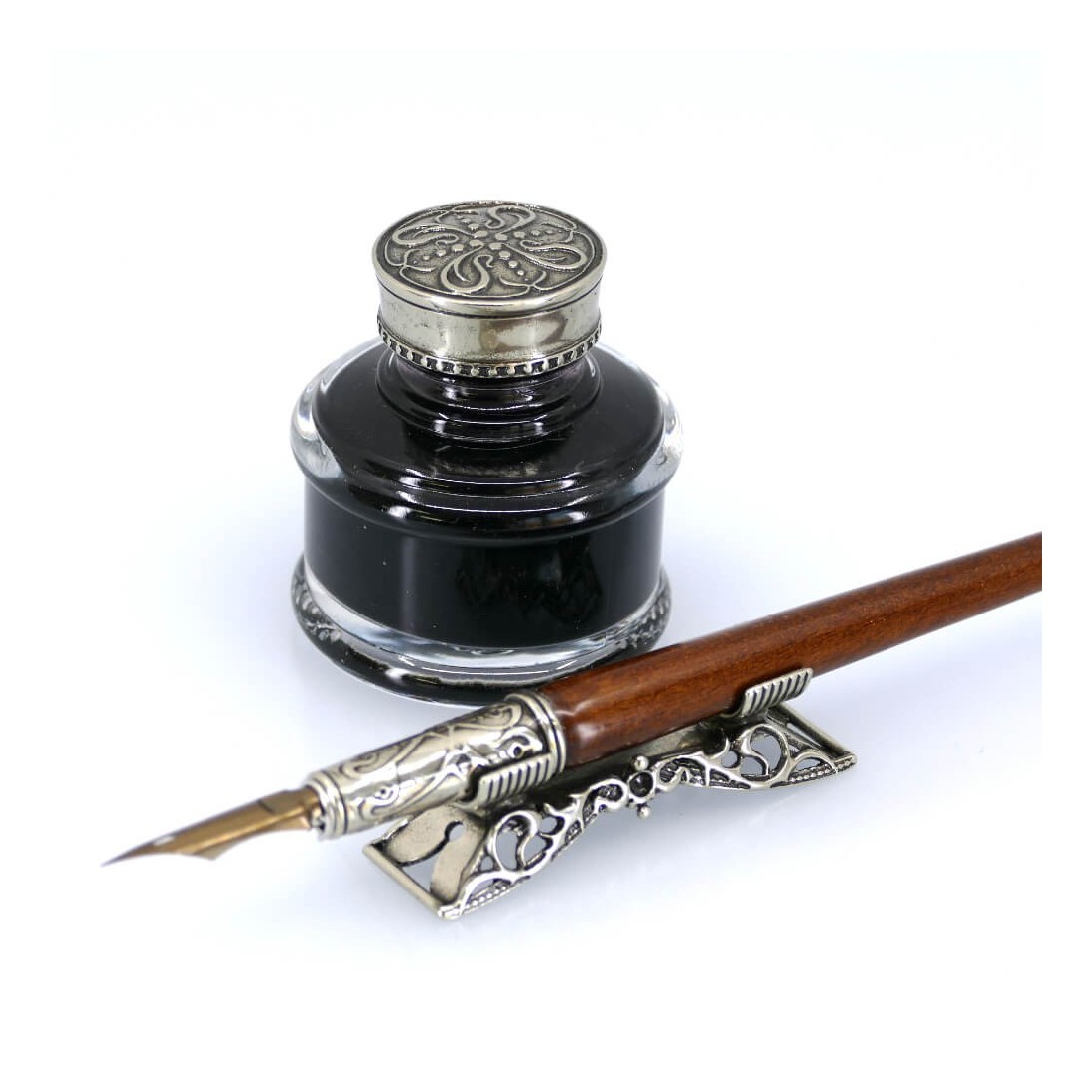 Inkwell är färdig med en bronskruvlock och är utformad för att hålla Hamburg kalligrafi bläck. Denna praktiska funktion hjälper till att bevara bläcket medan du lägger till satsens dekorativa överklagande. Glaset Inkwell sitter vackert vid sidan av träpenna och ger hela uppsägningen ett balanserat, sammanhängande utseende.