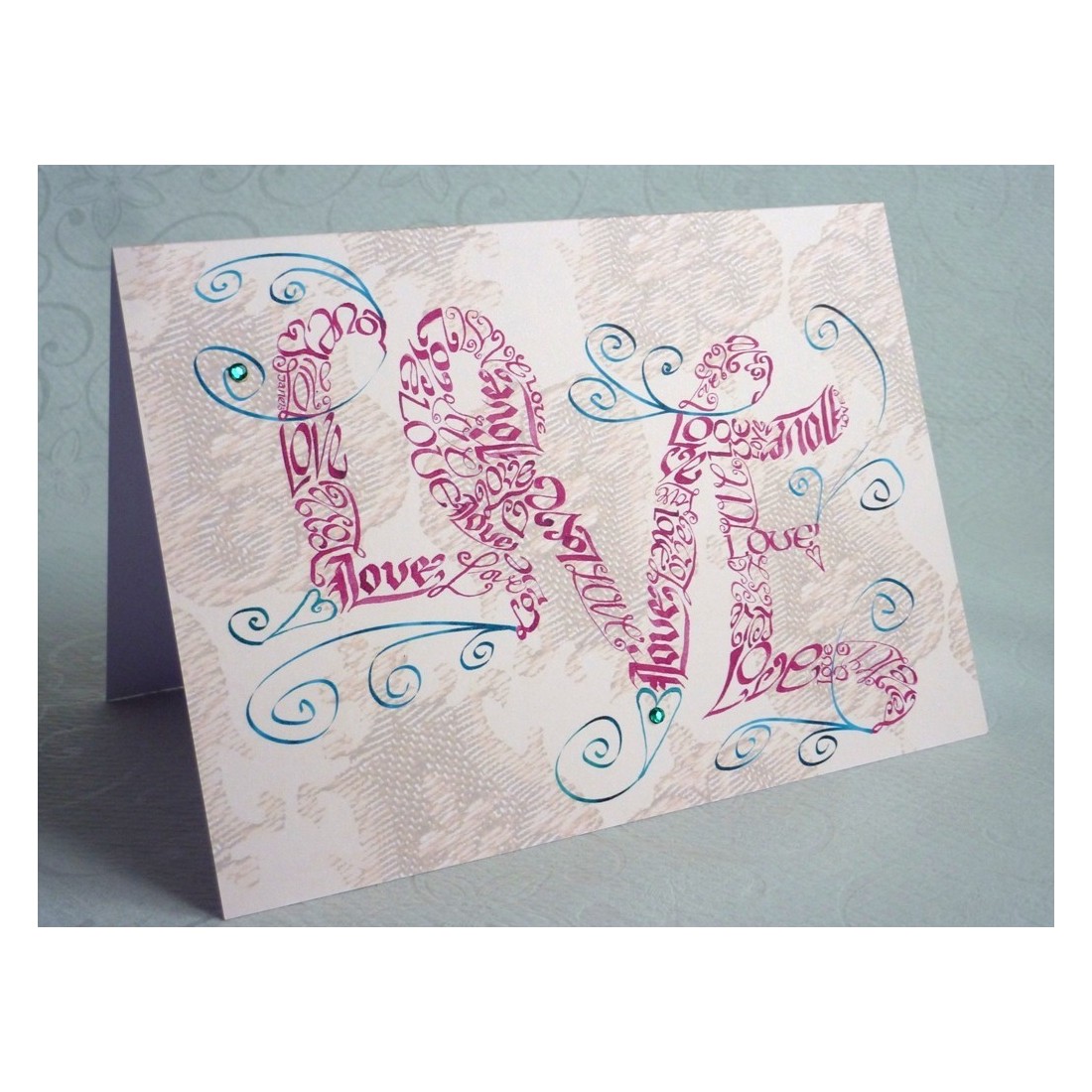Kombinationen av röd kalligrafi, vintage styling, flytande virvlar och noggrant placerade diamantes ger detta kort en raffinerad handgjord kvalitet. Det står förutom standardtryckta kort och är idealiskt för kunder som letar efter något mer distinkt och kreativt.