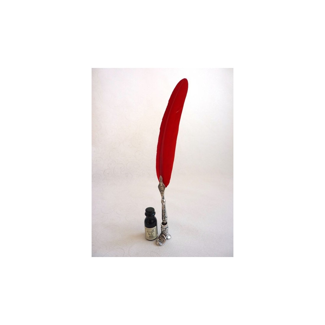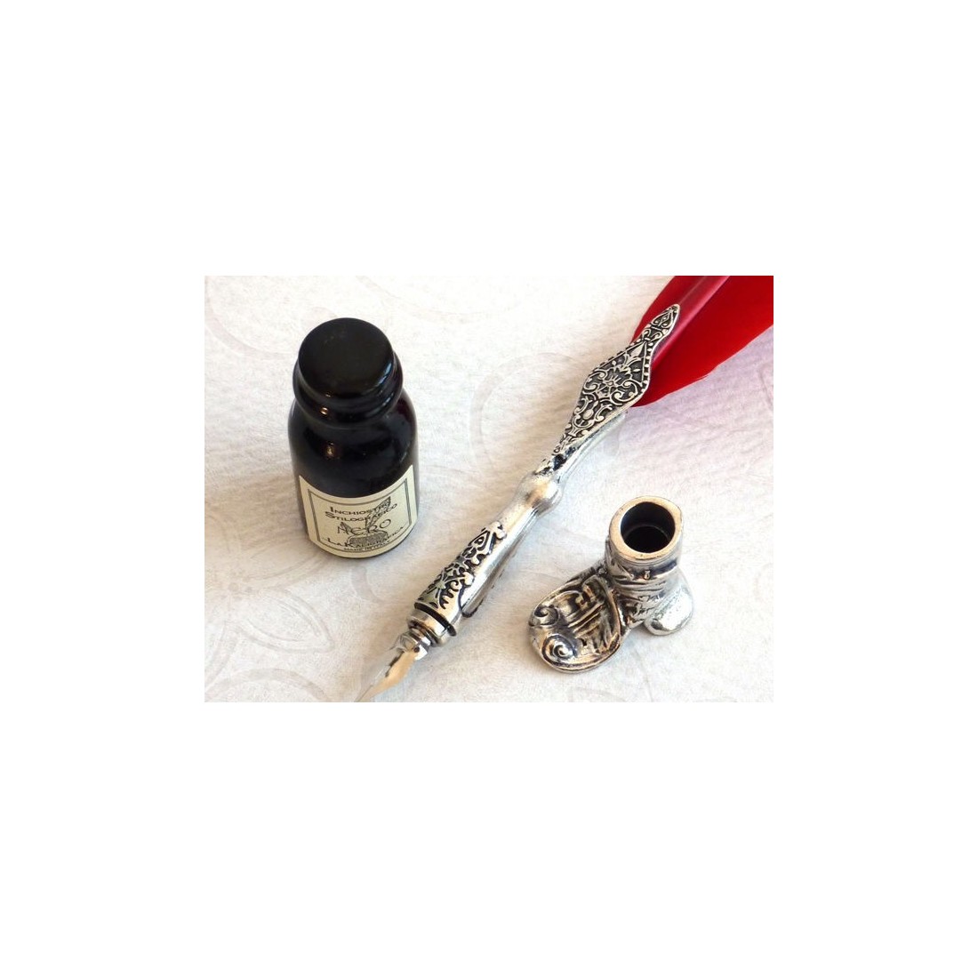 Satsen innehåller en röd gåsfjäderpenna med en tennkillsektion, en startstilpennhållare och en flaska svart bläck. Fjädern lägger till mjukhet och visuellt drama, medan tenndetaljeringen introducerar en traditionell dekorativ finish. Hållaren fullbordar uppsättningen genom att ge pennan en dedikerad viloplats när den inte används.