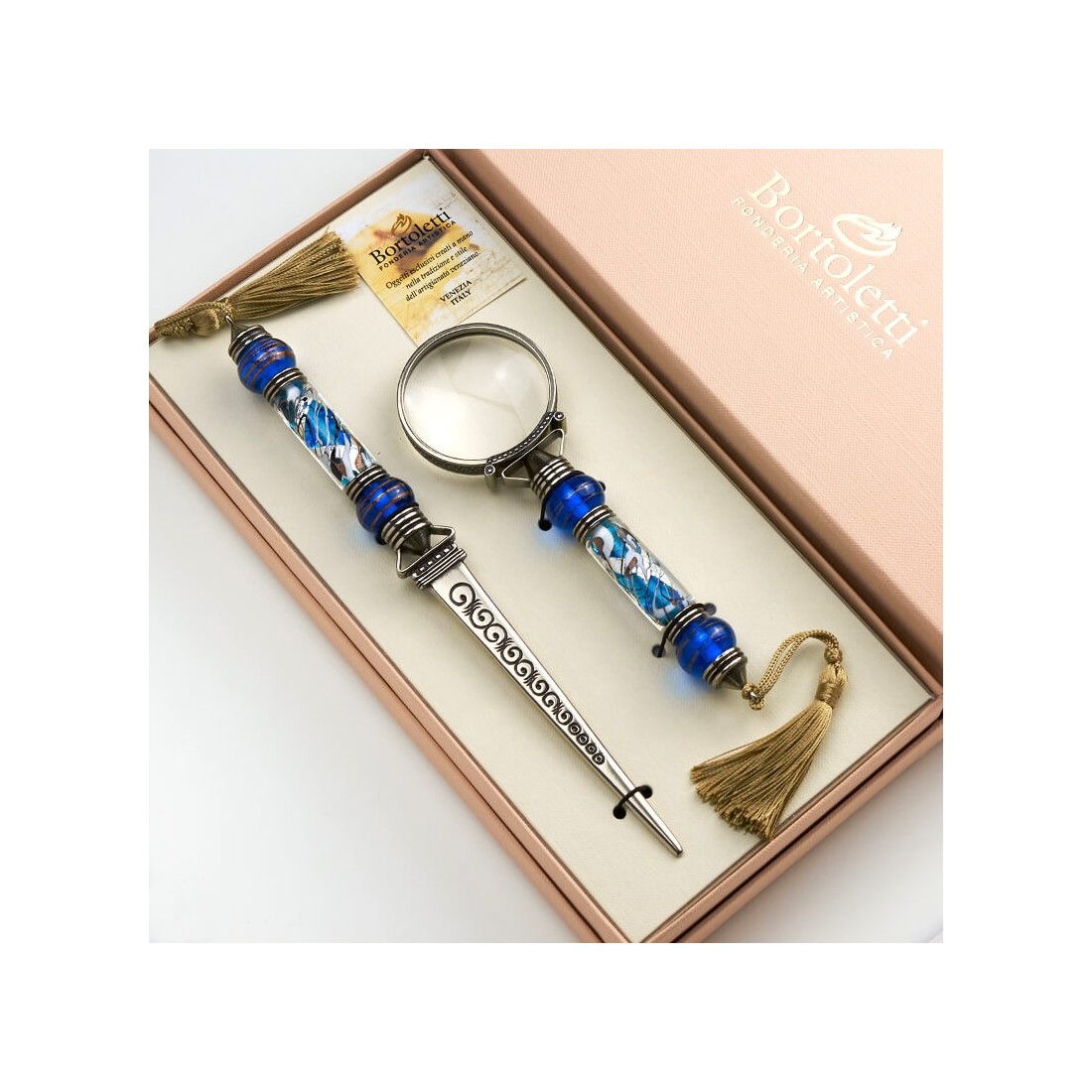 Bortoletti Fonderia Artistica i Venedig är känt för att producera fint utformade skrivartillbehör inspirerade av italienska dekorativa traditioner. Deras samlingar kombinerar konstnärligt metallarbete, Murano glas och handrad detaljering för att skapa skrivbordsverktyg som är både funktionella och visuellt särpräglade.