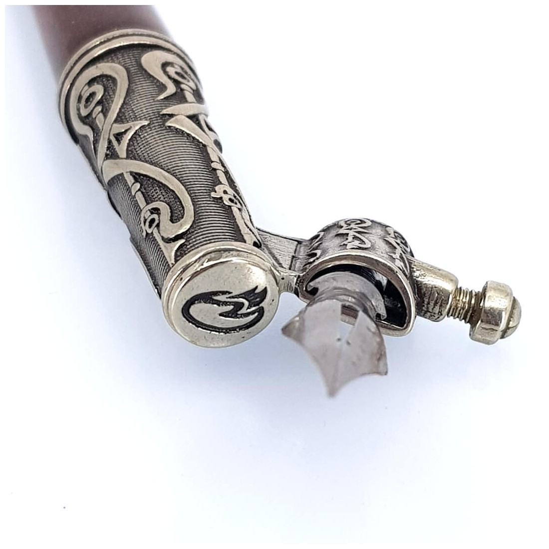 - Snett trä kalligrafi penna hållare med bronsfläns