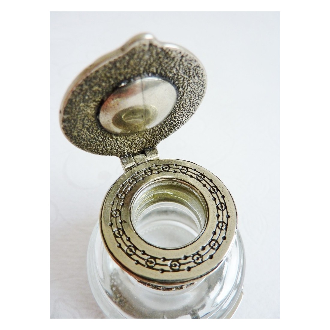 Denna eleganta bläckhorn är gjord av glas och handgjord nickelsilver och har en utsmyckad gångjärnslock. På flaskans framsida finns plats för att gravera ett namn, vilket gör den till en perfekt present. Utformad av Bortolettis mästerjuvelerare, kommer denna underbara bläckhorn att ge ett vackert tillskott till ditt skrivbord eller din kalligrafisats.
