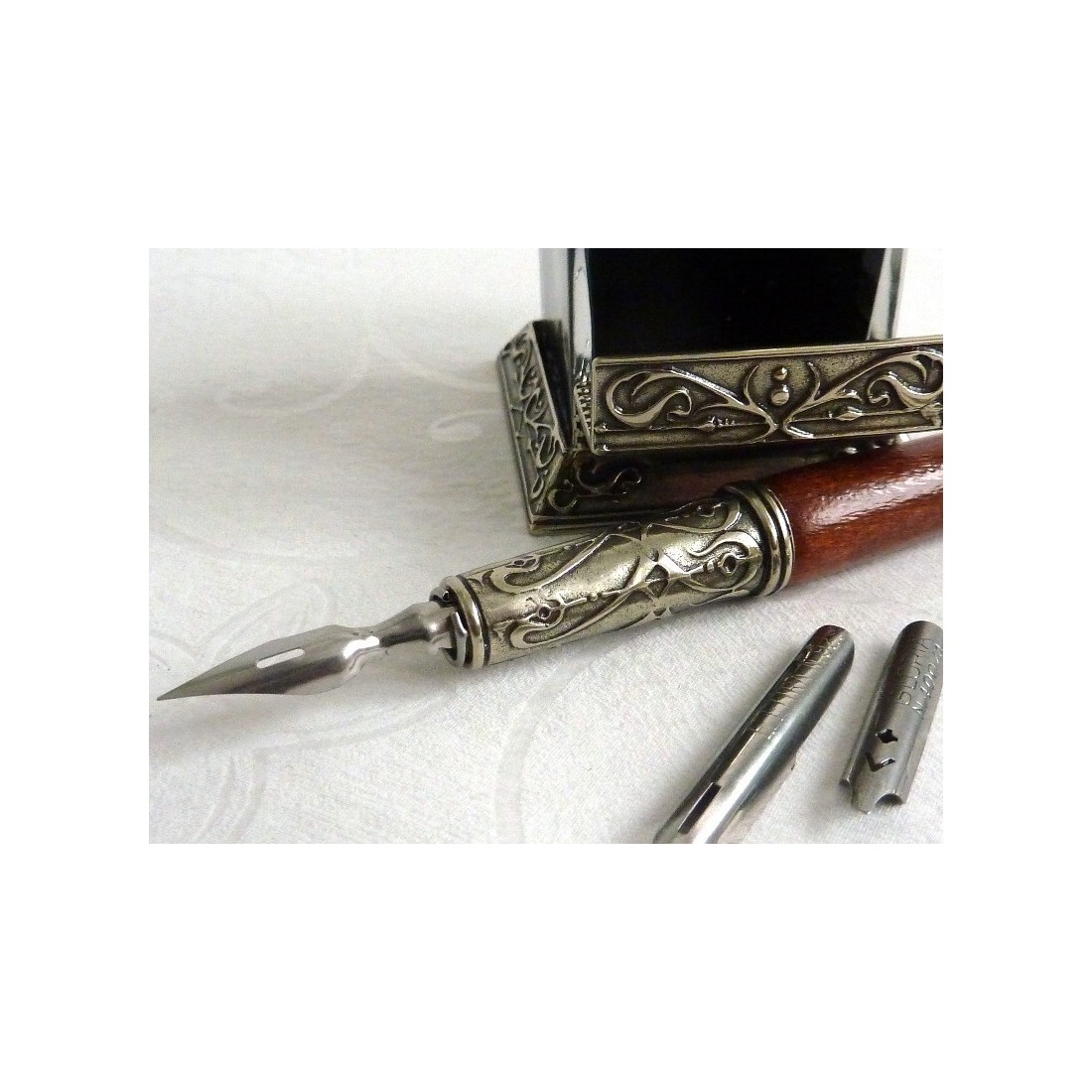 Trä kalligrafi penna som med bläckhorn och penna vila. Stort värde och förfining. Setet består av en trä penna med brons spets hållare pläterad i nysilver, bläckhorn och fyra antika spetsar.