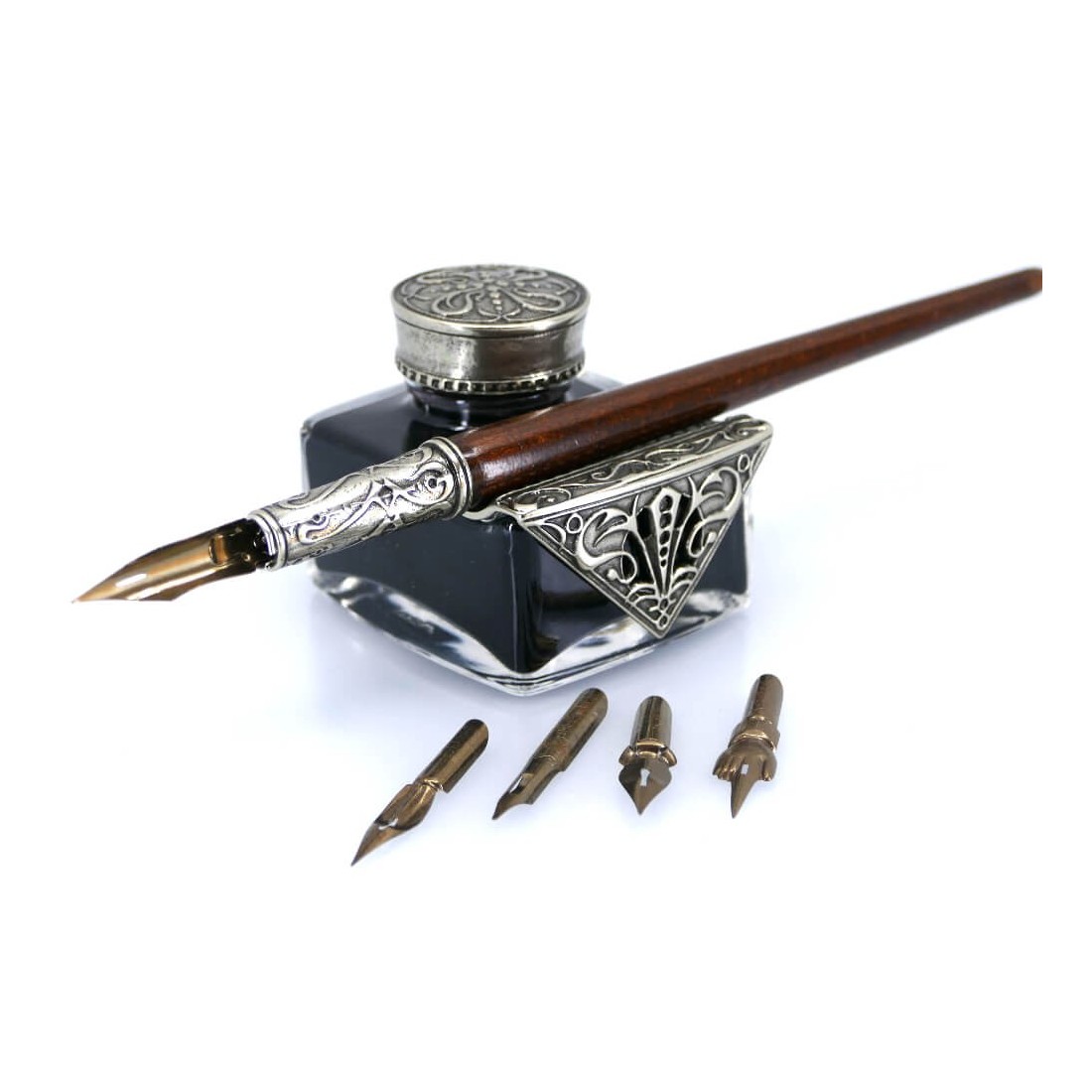 En utmärkt kalligrafi dopppenna uppsättning, som består av en trä kalligrafi dopppenna, alpaca glas bläckhorn med en integrerad brons penna hållare. Komplett med fem antika spetsar.